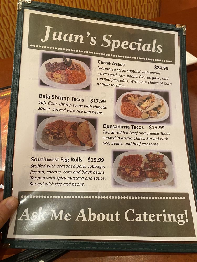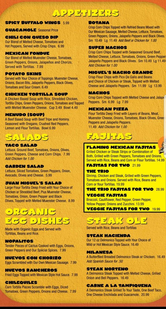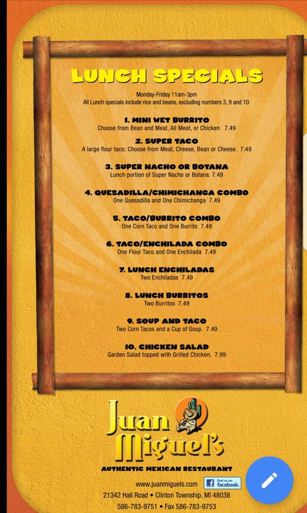 Juan Miguel's is a vibrant Mexican restaurant in Clinton Township, MI, featuring a range of lunch specials like Super Tacos, Quesadilla/Chimichanga Combos, and Mini Wet Burritos. The lunch specials come with rice and beans and offer a variety of options for both meat lovers and vegetarians. The appetizers include tempting choices like Miguel's Nacho Grande, Mexican Pizza, and Menudo Soup. The venue offers a casual setting with attentive waiter service, making it a great spot for groups and families. Customers praise the friendly staff and the generous portion sizes that offer great value for money. The flaming fajitas and fresh fish tacos have particularly received high compliments. A must-visit for authentic Mexican flavors and a warm, inviting atmosphere.