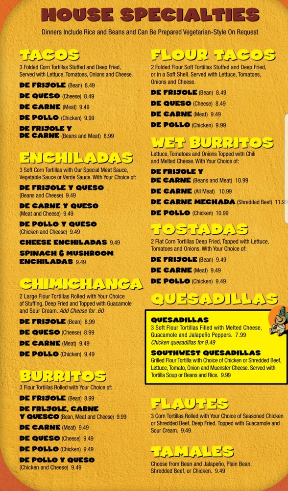 3 Soft flour tortillas filled with melted cheese, guacamole and jalapeno peppers. Dinners include rice and beans.